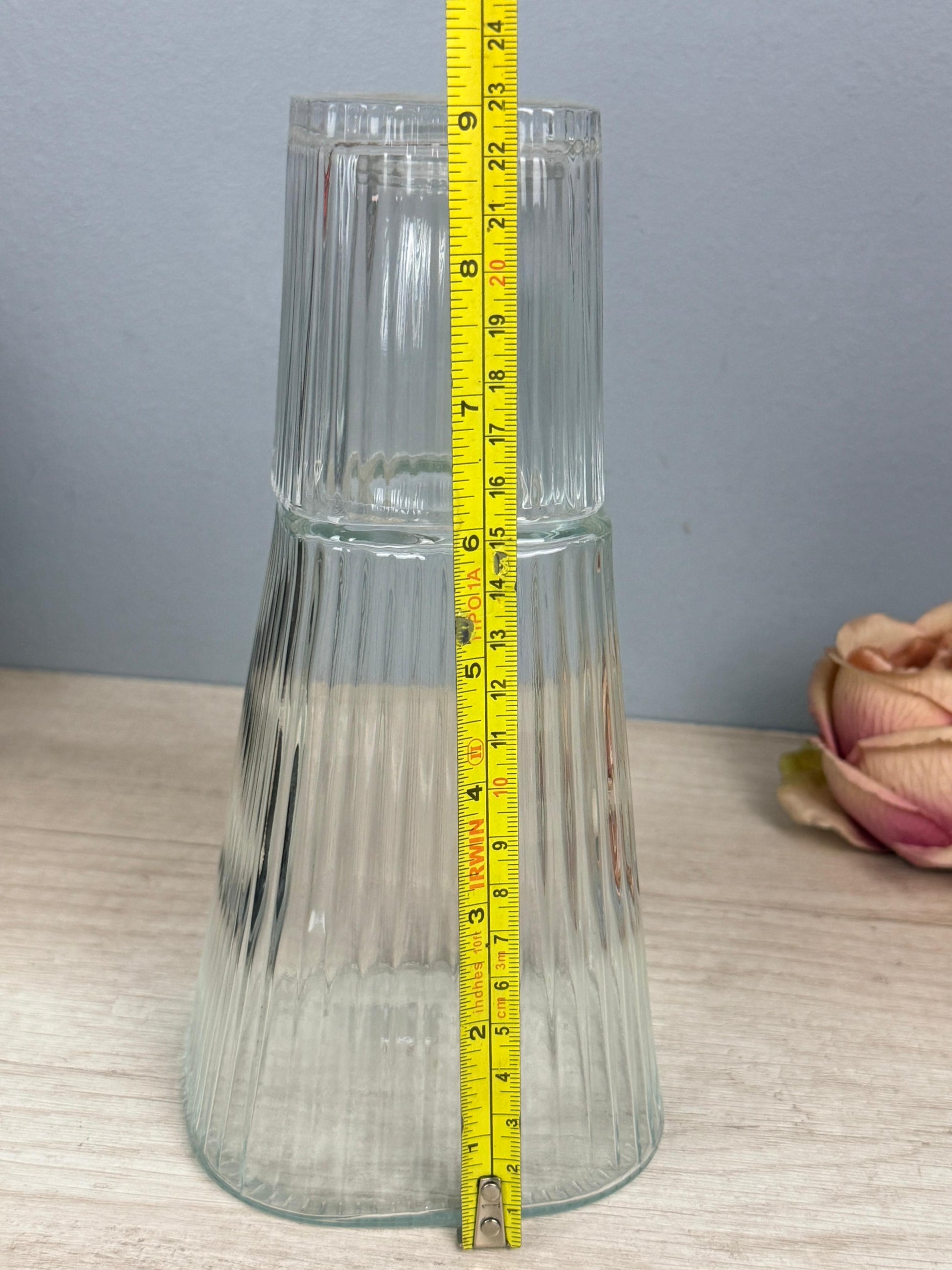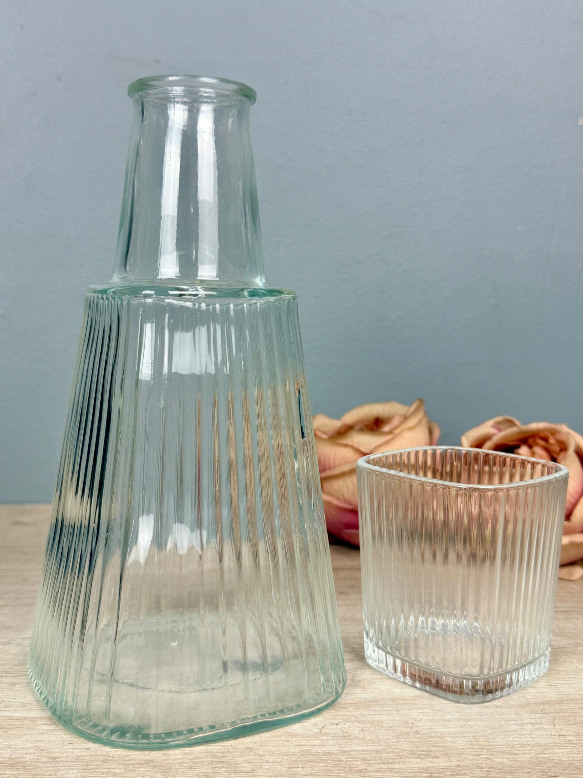 Este elegante conjunto de Jarra de Noche + Vaso (también conocido como tumble-up), es bello y funcional. Fabricados en vidrio transparente, destacan por su diseño de líneas verticales acanaladas en relieve, un estilo que aporta una textura visual sofisticada y un agarre seguro. El vaso, está diseñado específicamente para encajar de forma invertida, sobre el cuello de la jarra, actuando como tapa para mantener el agua fresca y libre de polvo durante la noche.