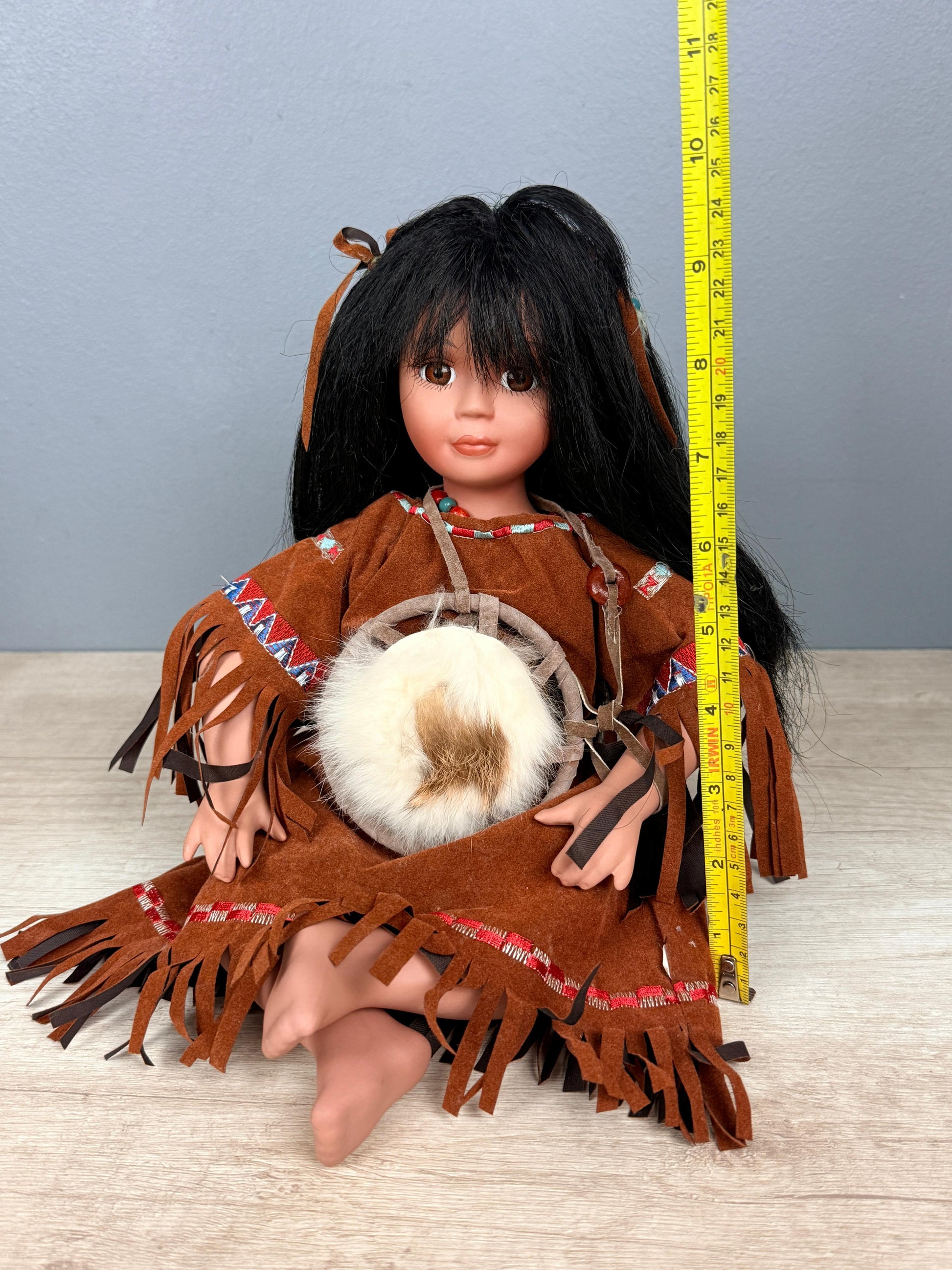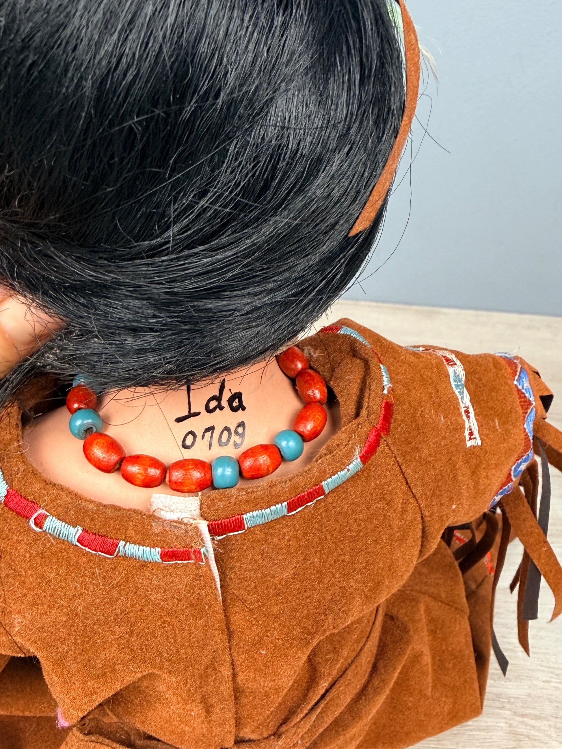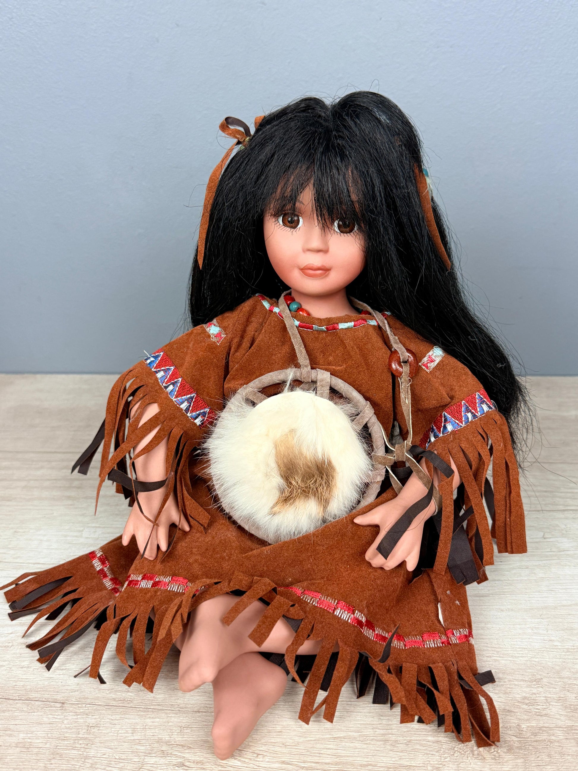Encantadora muñeca de colección, de cabeza y extremidades de porcelana, su estética, esta inspirada en las culturas originarias de Norteamérica.